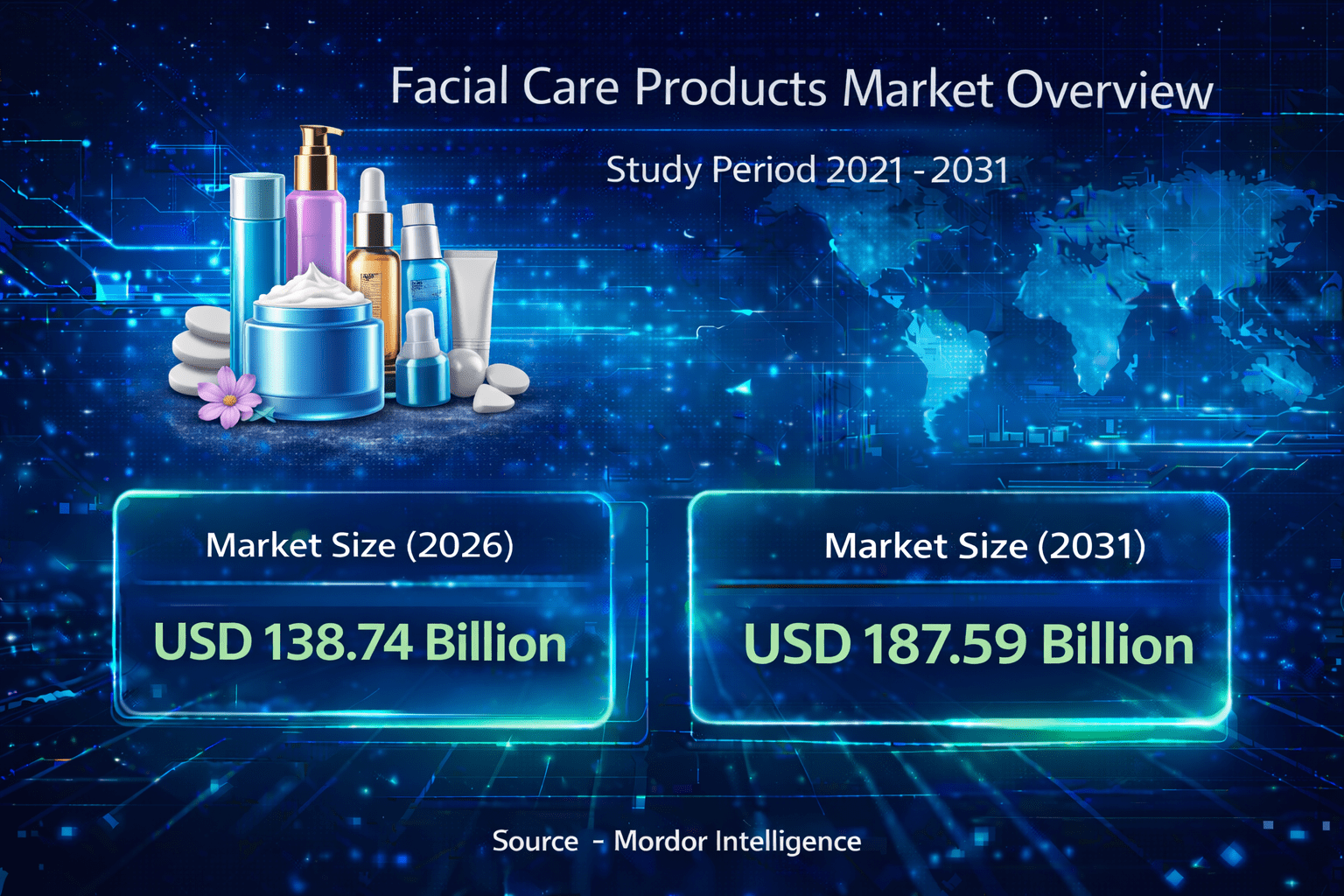 The global facial care products market size is projected to grow from USD 138.74 billion in 2026 to USD 187.59 billion by 2031, reflecting steady expansion during the forecast period. The positive facial care products market growth trajectory is fueled by increasing awareness of skin protection, anti-aging needs, and safe ingredient formulations.
