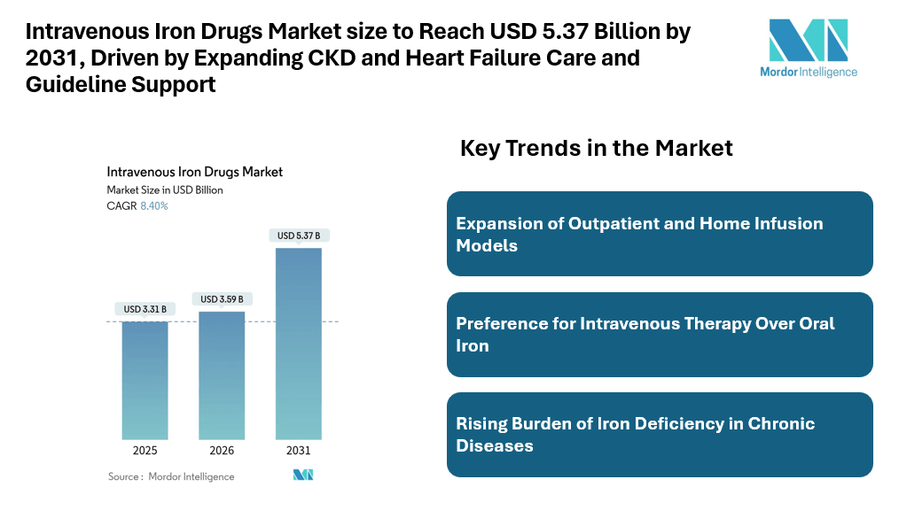 According to Mordor Intelligence, the intravenous iron drugs market size is witnessing steady expansion, with the intravenous iron drugs market size projected to increase from USD 3.31 billion in 2025 to USD 3.59 billion in 2026, and further reach USD 5.37 billion by 2031, registering a CAGR of 8.40% during the forecast period. This intravenous iron drugs market forecast reflects the growing need for rapid and effective correction of iron deficiency anemia across chronic kidney disease, heart failure, inflammatory bowel disease, and oncology care.